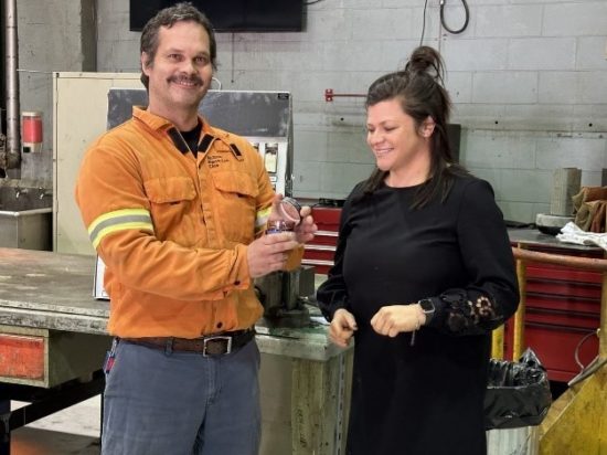 Lors de l’activité avec les employé(e)s, Pierre-Luc Côté, technicien de procédé à l’Usine de Fluorure a procédé à l’inauguration du premier pot de confiture en compagnie d’Émilie Gaudreault, productrice de bleuets et propriétaire de Délices du Lac-St-Jean.
