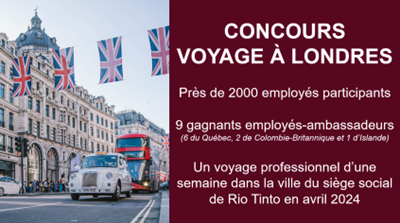 Un concours grandiose : « Découvre ton Rio Tinto mondial… à Londres! » L’objectif? En apprendre plus sur l’histoire de Rio Tinto, les priorités, les groupes de produits et nos partenariats – le tout aligné avec les valeurs d’entreprise que sont la bienveillance, le courage et la curiosité. En tant qu’ambassadrices, les personnes gagnantes partageront leur expérience et leurs apprentissages.