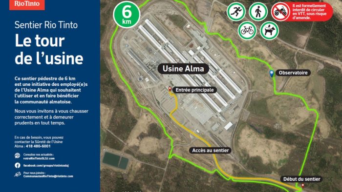 Quelques ajustements auront été nécessaires en cours de route. D’une distance de six kilomètres, le sentier mène jusqu’au belvédère qui permet d’apprécier l’ampleur des installations de l’usine Alma.